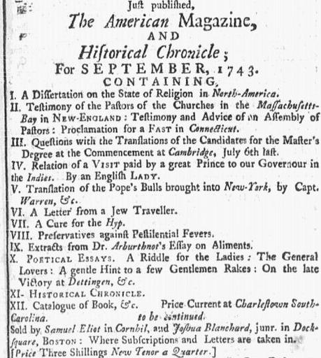 Keywords: 1743 AmericanMagazine BostonEveningPost Oct31.png en Newspaper item related to The American Magazine and Historical Chronicle Boston Massachusetts Boston Evening Post Boston Evening Post 1743 American Magazine and Historical Chronicle PD-old-100 |