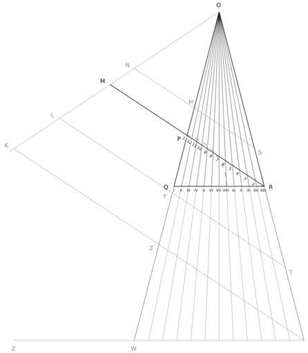 | Keywords: 1743Strahle tabvifig4.svg en Illustration of Daniel Stråhle's geometric method for generating the sounding lengths of strings in an irregular tuning with twelve pitches per octave that is close to equal temperament Line segment MR represents the string length of the lowest sounding pitch MP the pitch one octave higher and the points labeled 2 through 12 the endpoints for the pitches between them Daniel P Stråhle Nytt Påfund at finna Temperaturen i stämningen för thonerne å Claveret ock dylika Instrumenter Kongliga Swenska Wetenskaps Academiens Handlingar vol IV October November ock December Lorentz Ludewig Grefing Stockholm 1743 p 281-285 Daniel P Stråhle; reproduced as svg by User Mireut 1743 http //gdz sub uni-goettingen de/dms/load/img/ PPN PPN324352840_0005 DMDID dmdlog58 PD-old-100 Musical tuning Music diagrams |