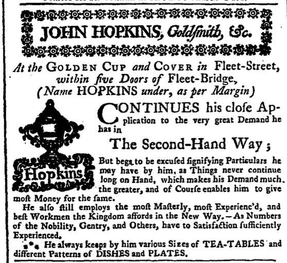 | Keywords: 1751 GoldenCup advertisement in Whitehall Evening Post or London Intelligencer January3.png Advertisement for goldsmith; at the Golden Cup and Cover in Fleet Street within five doors of Fleet-Bridge London Whitehall Evening Post or London Intelligencer London England January 3 1751 1751 Whitehall Evening Post or London Intelligencer London England PD-old-100 Shop signs in 18th century London 1751 Goldsmiths 1751 1751 in London | ||||