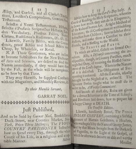 | Keywords: 1755 GarratNoel NY BostonPublicLibrary p22.jpg From A catalogue of books in history divinity law arts and sciences and the several parts of polite literature to be sold by Garrat Noel bookseller in Dock-Street New York New-York Printed by H Gaine in Queen-Street between the Fly and Meal-Markets 1755 24 p ; 16 cm Courtesy of the Trustees of the Boston Public Library/Rare Books 1755 Printed by H Gaine PD-old-100 Garrat Noel | ||||