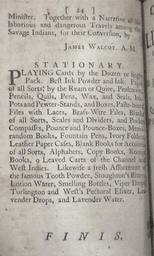 | Keywords: 1755 GarratNoel NY BostonPublicLibrary p24.jpg From A catalogue of books in history divinity law arts and sciences and the several parts of polite literature to be sold by Garrat Noel bookseller in Dock-Street New York New-York Printed by H Gaine in Queen-Street between the Fly and Meal-Markets 1755 24 p ; 16 cm Courtesy of the Trustees of the Boston Public Library/Rare Books 1755 Printed by H Gaine PD-old-100 Garrat Noel | ||||