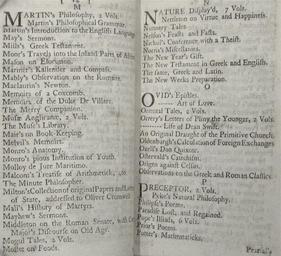 | Keywords: 1755 GarratNoel NY BostonPublicLibrary p14.jpg From A catalogue of books in history divinity law arts and sciences and the several parts of polite literature to be sold by Garrat Noel bookseller in Dock-Street New York New-York Printed by H Gaine in Queen-Street between the Fly and Meal-Markets 1755 24 p ; 16 cm Courtesy of the Trustees of the Boston Public Library/Rare Books 1755 Printed by H Gaine PD-old-100 Garrat Noel | ||||