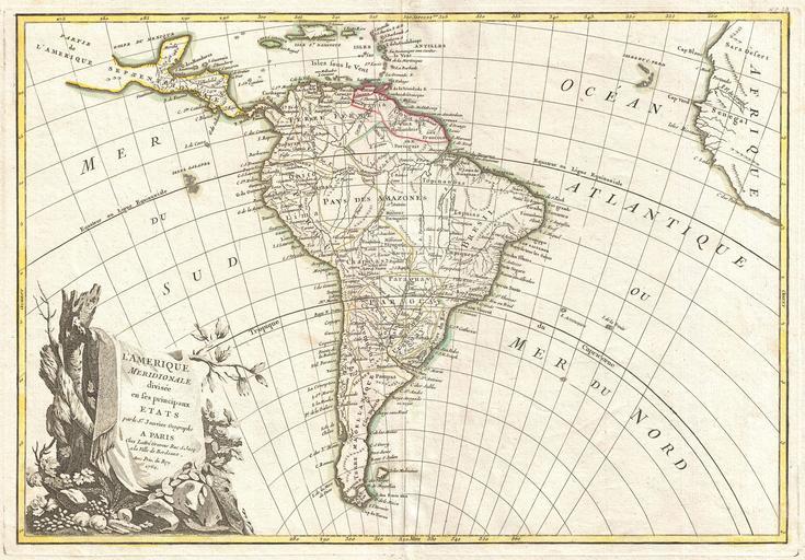 | Keywords: 1762 Janvier Map of South America - Geographicus - SouthAmerica-janvier-1762.jpg A beautiful example of Jan Janvier's 1762 decorative map of South America Covers from the island of Hispaniola and the Yucatan south to Tierra del Fuego and Cape Horn east to Africa and west to Mexico Details the whole of the South American continent showing mountains rivers national boundaries cities regions and tribes Identifies the mythical Laguna de Xarayes supposed gateway to paradise or El Dorado as the northern terminus of the Paraguay River Also erroneously links the Amazon and Orinoco Rivers A large decorative title cartouche appears in the lower left quadrant Drawn by J Janvier c 1762 for issue as plate no 33 in Jean Lattre's 1776 issue of the Atlas Moderne 1762 dated Size in 16 12 5 object history credit line accession number SouthAmerica-janvier-1762 Lattre Jean <i>Atlas Moderne ou Collection de Cartes sur Toutes les Parties du Globe Terrestre</i> c 1775 Geographicus-source PD-old-100 Maps by Jean Janvier 1762 maps Old maps of South America French language maps of South America |