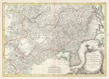 | Keywords: 1770 Bonne Map of Chinese Tartary, Mongolia, Manchuria and Korea (Corea) - Geographicus - TartarieChine-bonne-1770.jpg A beautiful example of Rigobert Bonne's 1770 decorative map of Chinese Tartary Covers from the Lop Nor region eastward to Korea Manchuria Sakalin and Jeso-Gasima Hokkaido Includes both Inner Mongolia and Outer Mongolia Extends north to include Lake Baikal Names numerous towns cities and river systems Shows the Great Wall of China At the far eastern extreme of this map Jeso-Gasimia or Hokkaido is mapped speculatively along its northern shore The island of Sahalien or Sakhalin also appears with erroneous shores A decorative title cartouche appears in the lower right corner This is an uncommon and rarely seen map Drawn by R Bonne in 1770 for issue as plate no A 27 in Jean Lattre's 1776 issue of the Atlas Moderne 1771 dated Size in 17 12 object history credit line accession number TartarieChine-bonne-1770 Lattre Jean <i>Atlas Moderne ou Collection de Cartes sur Toutes les Parties du Globe Terrestre</i> c 1775 Geographicus-source PD-old-100 Maps by Rigobert Bonne 1771 maps 18th-century maps of China Old maps of Korea Old maps of Mongolia |