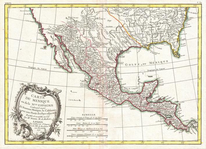 | Keywords: 1771 Bonne Map of Mexico (Texas), Louisiana and Florida - Geographicus - Mexico-bonne-1771.jpg A beautiful example of Rigobert Bonne's 1771 map of Mexico and Florida Covers from Baja California eastward to Florida and Carolina extend northwards as far as the mouth of the Chesapeake Bay and southwards to Panama Bonne being a very cautious cartographer abandons many of the fictious elements common to many period maps of this region thus most unexplored areas are left blank Being primarily a map of Mexico and the Spanish holdings in North America this excellent map details the various Mexican states naming countless towns villages and haciendas The map extends northward into the vast and largely unknown American West Identifies numerous missionary stations along the Rio Bravo or Rivera du Nord Rio Grande extending well northing to New Mexico towards Santa Fe Also names the various American Indian groups who traded with the French in Louisiana Southern Florida is rendered as an archipelago in a primitive attempt at describing the Everglades Drawn by R Bonne in 1771 for issue as plate no C 32 in Jean Lattre's 1776 issue of the Atlas Moderne 1771 dated Size in 16 12 object history credit line accession number Mexico-bonne-1771 Lattre Jean <i>Atlas Moderne ou Collection de Cartes sur Toutes les Parties du Globe Terrestre</i> c 1775 Geographicus-source PD-old-100 Old maps of Mexico Maps of the Viceroyalty of New Spain Old maps of Central America Old maps of North America 1771 maps Mexico in the 18th century Maps in French |