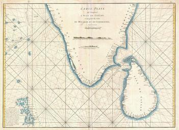 | Keywords: 1775 Mannevillette Map of Southern India and Ceylon or Sri Lanka - Geographicus - CeylonIndia-mannevillette-1775.jpg An extremely attractive large format 1775 maritime map or nautical chart of southern India and Ceylon by Jean-Baptiste d'Après de Mannevillette This chart covers the southern tip of India including the Malabar and Coromandel coasts as well as the Island of Ceylon Sri Lanka and the Maldives Extends northwards as far as Cabo and Madras and eastwards as far as the Maldives and Laccadive Islands Inland detail in minimalist but marine detail is excellent with well-defined coastlines many rhumb lines numerous harbors and ports noted and countless depth soundings The chart includes two shore profiles focusing on Cape Comorin Mannevillette ™s chart marks a considerable advancement over previous nautical maps of this region Engraved by De La Haye for Jean-Baptiste d'Après de Mannevillette ™s 1775 Neptune Oriental 1775 undated Size in 27 20 object history credit line accession number CeylonIndia-mannevillette-1775 Mannevillette D'Apres de <i>Le Neptune Oriental</i> 1775 Geographicus-source PD-Art-100 1775 maps of India Old nautical charts Old maps of South India Old maps of Sri Lanka Jean-Baptiste d'Après de Mannevillette Old maps of the Indian Ocean Maps of India and Sri Lanka |