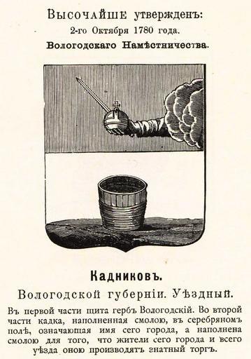 | Keywords: Кадников 1780 из Винклера.jpg Official Russian Empire coat of arms Kadnikov Гласный ге б кадка Российской Импе ии уездного го ода Кадников Вологодской губе нии с официальным описанием в Ге бовнике Винкле а П П фон-Винкле Ге бы го одов губе ний областей и посадов Российской Импе ии внесенные в Полное Соб ание законов с 1649 по 1900 год Дозволено цензу ою С -Пете бу г 20 Июля 1899 года Издание книгото говца Ив Ив Иванова С -Пете бу г Типог афия И Комелова П яжка д 3 1899 \ Scanned 1780 \ 1899 published П П фон Винкле \ Pavel von Vinkler PD-old PD-RusEmpire PD-RU-exempt coats of arms Gerbovnik Vinklera - City CoAs Coats of arms of cities in Vologda Oblast Coats of arms of Vologda Governorate Russian canting arms |