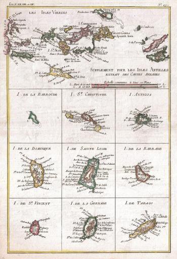 | Keywords: 1780 Raynal and Bonne Map of the Virgin Islands and Antilles, West Indies - Geographicus - Antilles-bonne-1780.jpg A fine example of Rigobert Bonne and Guilleme Raynal ™s 1780 map of the Antilles or West Indies Essentially 10 maps in one Uppermost map is the largest and details the region from Porto Rico to St Martin encompassing the Virgin Islands Nine smaller maps include Barbados St Christopher Antigua Dominica St Lucia Barbuda St Vincent Granada and Tobago All identify important towns ports and topographical features Cartographically these maps are based on English nautical charts of the period All names and text in French Drawn by R Bonne for G Raynal ™s Atlas de Toutes les Parties Connues du Globe Terrestre Dressé pour l'Histoire Philosophique et Politique des Établissemens et du Commerce des Européens dans les Deux Indes 1780 undated Size in 13 9 object history credit line accession number Antilles-bonne-1780 Raynal G <i>Atlas de Toutes les Parties Connues du Globe Terrestre Dressé pour l'Histoire Philosophique et Politique des Établissemens et du Commerce des Européens dans les Deux Indes</i> 1780 Geographicus-source PD-old-100 1780 maps Old maps of the Caribbean Old maps of Antigua and Barbuda Old maps of Barbados Old maps of Dominica Old maps of Saint Lucia Old maps of Trinidad and Tobago Old maps of Saint Kitts and Nevis Caribbean in the 1780s |