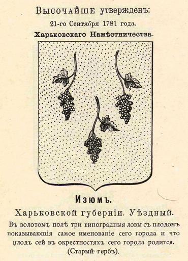 | Keywords: Хар губ Изюм 1781 из Винклера.jpg Official Russian Empire coat of arms Izum Т н гласный ге б изюм Российской Импе ии уездного го ода Изюм Ха ьковской губе нии с официальным описанием в Ге бовнике Винкле а П П фон-Винкле Ге бы го одов губе ний областей и посадов Российской Импе ии внесенные в Полное Соб ание законов с 1649 по 1900 год Дозволено цензу ою С -Пете бу г 20 Июля 1899 года Издание книгото говца Ив Ив Иванова С -Пете бу г Типог афия И Комелова П яжка д 3 1899 \ Scanned paper book 1775 Ге бовник Ще батова /1781 утве ждён / 1899 published П П фон Винкле \ Pavel von Vinkler PD-old PD-RusEmpire PD-RU-exempt coats of arms Gerbovnik Vinklera - City CoAs Изюm Coats of arms of Izium 1781 in Kharkov Governorate Russian canting arms |