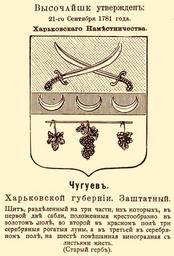 | Keywords: Хар губ Чугуев 1781 из Винклера.jpg Official Russian Empire Chuguev coat of arms Chuguev Ге б Российской Импе ии заштатного го ода Чугуев Ха ьковской губе нии с официальным описанием в Ге бовнике Винкле а П П фон-Винкле Ге бы го одов губе ний областей и посадов Российской Импе ии внесенные в Полное Соб ание законов с 1649 по 1900 год Дозволено цензу ою С -Пете бу г 20 Июля 1899 года Издание книгото говца Ив Ив Иванова С -Пете бу г Типог афия И Комелова П яжка д 3 1899 \ Scanned paper book 1775 Ге бовник Ще батова /1781 утве ждён / 1899 published П П фон Винкле \ Pavel von Vinkler PD-old PD-RusEmpire PD-RU-exempt coats of arms Gerbovnik Vinklera - City CoAs Чугуeв Coats of arms of Chuhuiv 1781 in Kharkov Governorate Swords in heraldry 3 crescents argent in heraldry |