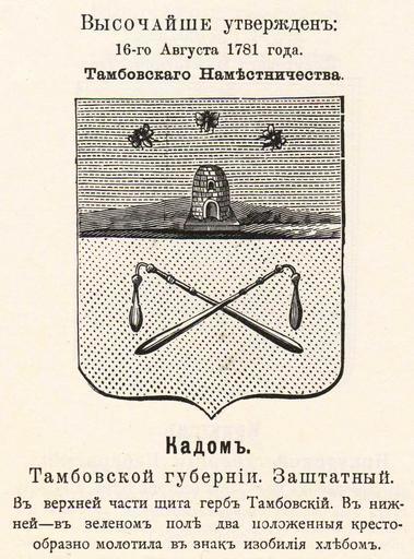 | Keywords: Кадом 1781 из Винклера.jpg Official Russian Empire Kadom coat of arms Ге б заштатного го ода Кадом Тамбовской губе нии Российской Импе ии с официальным описанием в Ге бовнике Павла Пет овича Винкле а П П фон-Винкле Ге бы го одов губе ний областей и посадов Российской Импе ии внесенные в Полное Соб ание законов с 1649 по 1900 год Дозволено цензу ою С -Пете бу г 20 Июля 1899 года Издание книгото говца Ив Ив Иванова С -Пете бу г Типог афия И Комелова П яжка д 3 1899 / Scanned 1781 / 1899 published П П фон Винкле / Pavel von Vinkler PD-old PD-RusEmpire PD-RU-exempt coats of arms Gerbovnik Vinklera - City CoAs Coats of arms of Tambov Governorate Agricultural tools in heraldry Bees in heraldry Beehives in heraldry |