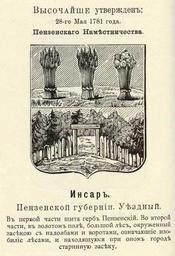 | Keywords: Инсар 1781 из Винклера.jpg Official Russian Empire Insar coat of arms Ге б уездного го ода Инса Пензенской губе нии Российской Импе ии с официальным описанием в Ге бовнике Павла Пет овича Винкле а П П фон-Винкле Ге бы го одов губе ний областей и посадов Российской Импе ии внесенные в Полное Соб ание законов с 1649 по 1900 год Дозволено цензу ою С -Пете бу г 20 Июля 1899 года Издание книгото говца Ив Ив Иванова С -Пете бу г Типог афия И Комелова П яжка д 3 1899 / Scanned 1781 / 1899 published П П фон Винкле / Pavel von Vinkler PD-old PD-RusEmpire PD-RU-exempt coats of arms Gerbovnik Vinklera - City CoAs Coats of arms of Penza Governorate Wheat garbs in heraldry Woods in heraldry Walls in heraldry |