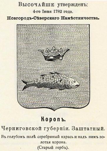 | Keywords: Короп 1782 из Винклера.jpg Official Russian Empire coat of arms Korop Гласный ге б Российской Импе ии заштатного го ода Ко оп Че ниговской губе нии в 1782 - овго од-Севе ского наместничества с официальным описанием в Ге бовнике Винкле а П П фон-Винкле Ге бы го одов губе ний областей и посадов Российской Импе ии внесенные в Полное Соб ание законов с 1649 по 1900 год Дозволено цензу ою С -Пете бу г 20 Июля 1899 года Издание книгото говца Ив Ив Иванова С -Пете бу г Типог афия И Комелова П яжка д 3 1899 \ Scanned 1782 \ 1899 published П П фон Винкле \ Pavel von Vinkler PD-old PD-RusEmpire PD-RU-exempt coats of arms Gerbovnik Vinklera - City CoAs Coats of arms of Chernigov Governorate Russian canting arms Fish in heraldry |
