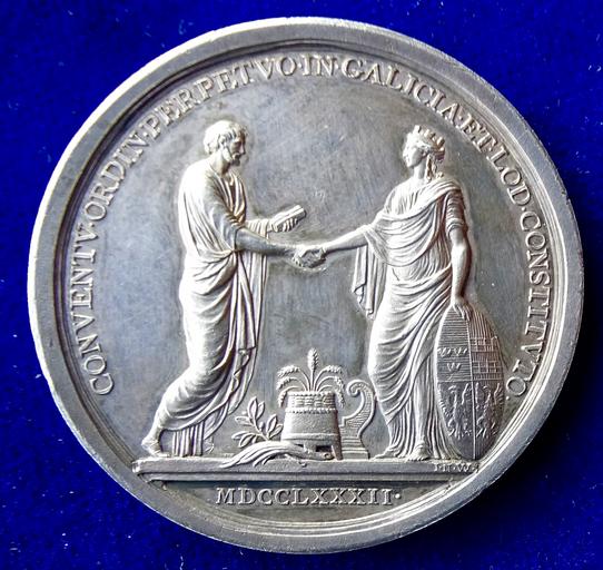 | Keywords: 1782 Medal Constitution of the Parliament in Galicia, Poland, reverse.jpg en In 1772 with the partition of the Polish-Lithuanian Commonwealth the south-eastern part of the former Polish-Lithuanian Commonwealth was awarded to the Habsburg Empress Maria-Theresa In 1782 a parliament was constituted by emperor Joseph II Known as Galicia and Lodomeria it became the largest most populous and northernmost province of the Austrian Empire until the dissolution of that monarchy at the end of World War I in 1918 when it ceased to exist as a geographic entity Silver medallion d 43 mm 26 23 g Ag Joseph II Holy Roman Emperor 1764 - 1790 Head r around IOS II AUG ET LOD R OSVIC ET ZAT D / The personification of Galicia r shaking hands with a Roman lawyer r Curved above CONVENTV ORDIN PERPETVO IN GALIZIA ET LOD CONSTITVTO In exergue MDCCLXXXII Slg Julius 2779; Forrer VI p 567 Medallist I N Johann Nepomuk Wirt 1753 Wien - 1811 Vienna Condition EXTREMELY FINE+ beautiful old patina 1782-12-31 own Berlin-George other versions cc-by-sa-4 0 PD-old-100 PD-1923 Medals of Austria 1782 medals |
