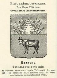 | Keywords: Каинск 1785 из Винклера.jpg Official Russian Empire Kainsk coat of arms Ге б го ода Каинск Тобольской губе нии Российской Импе ии с официальным описанием в Ге бовнике Павла Пет овича Винкле а П П фон-Винкле Ге бы го одов губе ний областей и посадов Российской Импе ии внесенные в Полное Соб ание законов с 1649 по 1900 год Дозволено цензу ою С -Пете бу г 20 Июля 1899 года Издание книгото говца Ив Ив Иванова С -Пете бу г Типог афия И Комелова П яжка д 3 1899 / Scanned 1785 / 1899 published П П фон Винкле / Pavel von Vinkler PD-old PD-RusEmpire PD-RU-exempt coats of arms Gerbovnik Vinklera - City CoAs Coats of arms of Tobolsk Governorate Buffalo in heraldry |