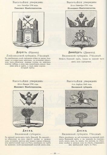 | Keywords: Дерпт Динабург Дисна 1796 1845 из Винклера.jpg Official Russian Empire coats of arms Ге бы го одов Российской Импе ии Де пт Ю ьев Та ту Лифляндской губе нии Динабу г Двинск Даугавпилс и Дисна Виленской губе нии с официальными описаниями в Ге бовнике Винкле а П П фон-Винкле Ге бы го одов губе ний областей и посадов Российской Импе ии внесенные в Полное Соб ание законов с 1649 по 1900 год Дозволено цензу ою С -Пете бу г 20 Июля 1899 года Издание книгото говца Ив Ив Иванова С -Пете бу г Типог афия И Комелова П яжка д 3 1899 \ Scanned by Vizu 1899 published П П фон Винкле \ Pavel von Vinkler PD-old PD-RusEmpire PD-RU-exempt coats of arms Gerbovnik Vinklera - Pages 046 Location not applicable Historical images of Pahonia Coats of arms of Liflandia Governorate History of Tartu Coats of arms of Vilno Governorate History of Daugavpils |