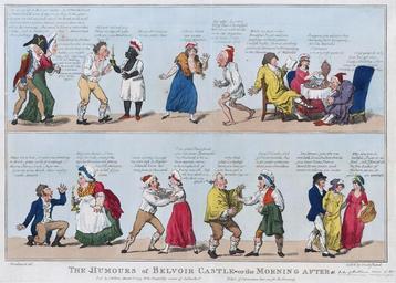 | Keywords: 1799-Belvoir-Castle-houseparty-Isaac-Cruikshank.jpg The Humours of Belvoir Castle -- or the Morning After a March 1st 1799 English caricature engraving showing the aftermath of a night of upper-class debauchery at a large country mansion marking the celebration of the owner's coming of age One's coming of age was the 21st birthday for most purposes but a will or other legal document could specify a different date on which the inheritor of a property would come into full legal control over it which was then the coming of age with respect to that particular property <br/> This is a precursor to the infamous Edwardian country-house weekends but in the pre-railway era of 1799 the whole occasion was likely to last longer than just a weekend Some old handwriting on this copy of the print says that Cruikshank was parodying the celebration of the Duke of Rutland's coming of age 1799-03-01 Edited from image at http //memory loc gov/master/pnp/ppmsca/07100/07198u tif Library of Congress creator Isaac Cruikshank PD-old-100 Text in image First tableau ;Inebriated Irishman Och Long life to Belvoir Castle -- by St Patrick I wish his honor would come of age every day in the year -- to be sure we did not push about the bottle at all at all -- and now here's a polite Damsel going to shew me to bed in the morning -- she seems to have a nation deal of bone -- but no matter for that -- Belvoir Castle forever I say ;Homely upper servant lady's-maid Come along Sir I'll shew you to a chamber -- it's a pity you should sleep in the Gallery you might take cold -- sotto voce bless me I would not have my Lady to see me for the world she would never have an opinion of my virtue again Second tableau ;Surprised ugly man Oh Lord Oh Lord why I have not slept all night with you -- you Black Devil have I ;Black woman servant not slave in a shift holding candle Iss you did and you be very pretty man Third tableau ;Hastily-attired woman I think I shall now escape without detection ;Caricature old man in nightshirt My wife -- by everything that is hornified they often told me she wore the Breeches and now I am convinced of it Hornified refers to the old image that a cuckold was horned Fourth tableau ;Reading man in dressing gown While my Sister makes Breakfast I will read you a passage in Shakespeare's Twelfth Night -- there is something peculiarly whimsical and interesting in the Character of Malvolio ;Woman pouring tea noticing that her brother is wearing a woman's shoe of the type tied to the leg by ribbons I suppose you admire that character from Sympathy -- for like Malvolio I perceive you are cross-garter'd ;Older man Cross-garter'd -- why Tom has got on a Lady's Stocking -- there must be some cursed mistake in this Fifth tableau ;Dissheveled drunken man Shew me to bed -- or give me something to drink -- great lump of loveliness -- devine Cherry-bum; -- hear me -- give me some drink thou mighty Castle Spectre ;Heavyset lower servant woman holding candle Bless your honor I am only the Cook -- most of the regular Families are getting up but I'll shew you to a bed if you please Sixth tableau ;Woman I am glad I have found you my Dear -- I persuaded my Husband to let us have separate rooms -- as he complain'd of being very ill -- bless me how dark it is -- why don't you speak ;Man sotto voce Here's a pretty business my own wife by Jupiter -- I should know her voice from a thousand Seventh tableau ;Uncle Why Jack what wickedness have you been at -- you have got a woman's cap on ;Nephew Jack Have I Uncle -- and if I don't mistake this is an under-petticoat about your shoulders Eighth tableau ;Lecherous upper-class man 'Pon Honor -- you are two nice little Lincolnshire Articles -- you must know I am a Bond Street Sailor and I insist on taking you in tow ;Experienced lower-class woman to inexperienced lower-class woman Why are you so bashful -- I was so at first -- till I found all the fine Ladies of Fashion set us so good an example For other Isaac Cruikshank caricatures with a similar overall structure see Image Ca-1795-militia-volunteers-drill-innuendo-caricature jpg and Image That-accounts-for-it-1799-caricature-Isaac-Cruikshank jpg ---- Bibliographic information found on the LoC site TITLE The humours of Belvoir Castle or the morning after / Woodward del ; etch'd by Cruikshank CALL NUMBER PC 3 - 1799--Humours of Belvoir Castle B size P P REPRODUCTION NUMBER LC-DIG-ppmsca-07198 digital file from original print No known restrictions on publication SUMMARY Print shows a number of encounters in two panels between men and women either off to bed or awakened to the horrors of the night before The first an old man on the arm of an old woman says Och Long life to Belvoir Castle and now heres a polite Damsel going to shew me to bed in the morning to which the woman responds Come along sir bless me I would not have my Lady to see me for the World She would never have an opinion of my virtue again The second encounter has a rather homely man discovering by candlelight that he has slept with an African woman who tells him you did and you be very pretty man The third encounter shows an old man exclaiming that he has often heard that his wife wore the Breeches and now I am convinced of it as he catches sight of her in her nightdress one breast exposed and a man's breeches around her shoulders and she thinking I shall now escape without detection of her adulterous activities The top panel closes with an old man sitting at a table having tea with a young couple the young man a rake proposes to read you a passage in Shakespeare's Twelfth Night - there is something peculiarly whimsical and interesting in the Character of Malvolio to which the young woman replies for like Malvolio I perceive you are cross garter'd and the old man exclaims Cross garter'd why Tom has got on a Lady's Stocking - there must be some cursed mistake in this The bottom panel continues in this vein with a man on one knee appealing to a plump woman Shew me 