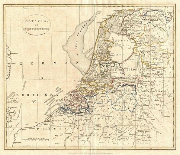 | Keywords: 1799 Clement Cruttwell Map of Holland or the Netherlands - Geographicus - Batavia-cruttwell-1799.jpg A fine 1799 map of Batavia or the United Dutch States the Netherlands by the English map publisher Clement Cruttwell Map is highly detailed with counties and municipalities outlined Of note on this particular map are the canals and dikes Cruttwell labeled These are extremely important to the country as two thirds of the land is vulnerable to flooding River dikes prevent flooding from water flowing into the country by the major rivers Rhine and Meuse while a system of drainage ditches canals and pumping stations windmills keep the low lying parts dry for habitation and agriculture The Beemster as Cruttwell notes in Northern Holland was the first of these and was reclaimed from a lake the water having been extracted by windmills He also labels what is known as the De Breeveertien De Bree Veerthien a large offshore shoal in the North Sea now home to an important wind farm In North Holland he identifies Zuyder Zee which at this point in time was a shallow bay in the North Sea In the 20th century the majority of the Zuyder Zee was closed off and the salt water inlet changed into a fresh water lake called the Ijsselmeer IJssel-lake named thus after the river that drains into it The whole offers hand color and fine copper plate engraving in the minimalist English style prevalent in the late 18th and early 19th centuries Drawn by G G and J Robinson of Paternoster Row London for Clement Cruttwell's 1799 Atlas to Cruttwell's Gazetteer 1799 dated Size in 16 5 14 object history credit line accession number Batavia-cruttwell-1799 Cruttwell C <i>Atlas to Cruttwell's Gazetteer</i> 1799 Geographicus-source PD-Art-100 Maps by Clement Cruttwell Old maps of the Netherlands 1799 maps |