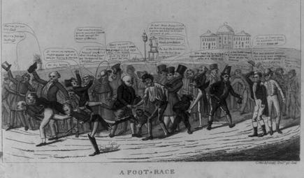 | Keywords: 1824 Footrace byDClaypooleJohnston LibraryOfCongress.jpg A foot-race 1824 By D C Johnston A figurative portrayal of the presidential race of 1824 A crowd of cheering citizens watch as candidates left to right John Quincy Adams William Crawford and Andrew Jackson stride toward the finish Henry Clay has dropped from the race and stands hand on head on the far right saying D--n it I cant save my distance--so I may as well draw up He is consoled by a man in riding clothes Well dont distress yourself--there'll be some scrubbing by by then you'll have a chance Assorted comments come from the crowd reflecting various sectional and partisan views A Westerner with stovepipe hat and powder horn Hurra for our Jacks- son Former President John Adams Hurra for our son Jack Two men in coachmen's livery That inne-track fellow Crawford goes so well; that I think he must have got the better of the bots boss and Like enough; but betwixt you I--I dont think he'll ever get the better of the Quinsy A ragged Irishman Blast my eyes if I dont venter a small horn of rotgut on that bald filly in the middle Adams A Frenchman Ah hah Mon's Neddy I tink dat kick on de back of you side is worse den have no dinner de fourt of july In the left background is a platform and an inaugural scene the Presidential Chair with a purse 1824 engraving by David Claypoole Johnston via Library of Congress Prints and Photographs Division Washington D C 20540 USA http //hdl loc gov/loc pnp/pp print at http //www loc gov/item/2008661728/ 1824 creator David Claypoole Johnston 1824 cartoons Caricatures of Andrew Jackson Caricatures of John Quincy Adams David Claypoole Johnston William Crawford Caricatures of Henry Clay United States presidential election 1824 PD-old-100 |