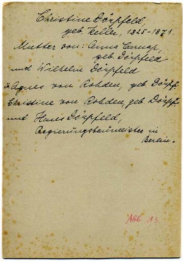 | Keywords: 1825-1871 Christine Dörpfeld, geb. Keller, Kabinettfotografie von Emil Flasche, Barmen, Revers.jpg Revers der Kabinettfotografie mit den handschriftlichen Erläuterungen Zitat Christine Dörpfeld geb Keller 1825-1871 Mutter von Anna Carnap geb Dörpfeld und Wilhelm Dörpfeld u Agnes von Rohden geb Dörpf Christine von Rohden geb Dörpf und Hans Dörpfeld Regierungsbaumeister in Berlin 'Sammlung Klaus Goebel http //bbf dipf de/cgi-opac/bil pl x u t_short x ix art sv emil+flasche+barmen reccheck 53337 ~ 1865 Emil Flasche <gallery> File 1825-1871 Christine Dörpfeld geb Keller Kabinettfotografie von Emil Flasche Barmen Bildseite jpg Bildseite </gallery> PD-old Emil Flasche Fotograf 19th-century people of Wuppertal Friedrich Wilhelm Dörpfeld Wilhelm Dörpfeld Hans Dörpfeld Klaus Goebel Pictura Paedagogica Online Bibliothek für Bildungsgeschichtliche Forschung |