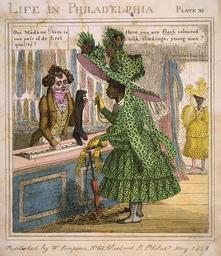 | Keywords: 1829-philadelphia-black-bourgeoisie-flesh-coloured.jpg Artwork creator Edward Williams Clay <br />Published by W Simpson Life in Philadelphia published in 1829-05 etching A caricature showing an African-American woman shopping while dressed in the very latest of high fashions; her similarly-attired friend waits in the doorway for her to finish her purchase As caricaturists often did the size of the woman's hat is exaggerated and the skirts are shown a little shorter than they would have been in real life see Image Waist-and-Extravagance-ca-1830-fashion-satire-Heath jpg for another typical example of these standard caricaturists' tricks from the same period This caricature is not really racist in itself and could even be considered to be subtly anti-racist in pointing out the relative meaning of the term flesh-colored but much of the humor which white Americans of 1829 would have perceived in it would have arisen from the racist preconceptions which they held Many white Americans would have found the very idea of a black bourgeoisie as it was later called or Black attempts to imitate White high-society to be inherently at least slightly ridiculous Dialogue in image ;Fashionably-attired African-American woman Have you any flesh-coloured silk stockings young man ;French shop-attendant who knows exactly what to do to please the customer Oui Madame Here is von pair of de first qualité Meaning Yes ma'am here is a pair which is of the highest quality C monogram bottom right ~ artist or engraver Edited from the image http //memory loc gov/master/pnp/cph/3g00000/3g02000/3g02400/3g02441u tif at the Library of Congress website <small>CALL NUMBER PGA - Clay Edward W --Life in Philadelphia A size P P<br /> REPRODUCTION NUMBER LC-USZC4-2441 color film copy transparency <br /> LC-USZ62-119316 b w film copy neg <br /> REPOSITORY Library of Congress Prints and Photographs Division<br /> Washington D C 20540 USA<br /> DIGITAL ID color film copy transparency cph 3g02441<br /> http //hdl loc gov/loc pnp/cph 3g02441<br /> b w film copy neg cph 3c19316<br /> http //hdl loc gov/loc pnp/cph 3c19316<br /> CARD 93503166</small> PD-old-100 1829 cartoons 1820s fashion Females with green dresses in art Females with green hats in art Caricatures of fashion African Americans in 19th-century art Clay 1829 in the United States Philadelphia in the 1820s Shopping in art Edward Williams Clay 1820s dresses |
