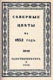 | Keywords: Северные цветы на 1832 год. Обложка.jpg en The title page of the Severnie tsveti russian Севе ные цветы literary miscellany of Anton Delvig Published by Alexander Pushkin 1832 ru Лите ату ный альманах Дельвига Севе ные цветы Обложка изданных А С Пушкиным Севе ных цветов на 1832 год Сделал сам Author 1832 PD-old Title pages from Russia Severnie tsvety 1832 books |