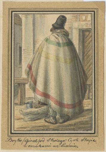 | Keywords: Бойко зі Сколе 1836.jpg uk Бойко зі Сколе 1836 Mężczyzna w ujęciu od tyłu w czarnym celenderze i pasiastej narzucie z workiem orzechów stojący przed drzwiami budynku Boyko Góral od Skolego Cyrk Stryis / z orzechami we Lwowie 2016-04-21 http //www europeana eu/portal/record/2058635/_pau_oai_pauart_pl_BGR_RT_007_074 html Kielisiński Kajetan Wincenty other versions PD-old-70-1923 Ukrainian costume collection by Kajetan Kielisiński | ||||