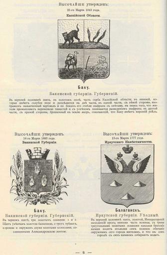 Keywords: Баку 1843 1883 Балаганск 1777 из Винклера.jpg Official Russian Empire coats of arms Ге бы го одов Российской Импе ии Баку Балаганск - с официальным описанием в Ге бовнике Винкле а П П фон-Винкле Ге бы го одов губе ний областей и посадов Российской Импе ии внесенные в Полное Соб ание законов с 1649 по 1900 год Дозволено цензу ою С -Пете бу г 20 Июля 1899 года Издание книгото говца Ив Ив Иванова С -Пете бу г Типог афия И Комелова П яжка д 3 1899 \ Scanned by Vizu 1777\ 1843\ 1883\ 1899 published П П фон Винкле \ Pavel von Vinkler PD-old PD-RusEmpire PD-RU-exempt coats of arms Gerbovnik Vinklera - Pages 008 Coats of arms of Irkutsk Governorate History of Baku Coats of arms of Baku Governorate