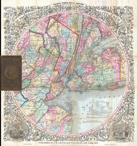 | Keywords: 1846 Colton Map of New York City and Vicinity (33 Miles Around) - Geographicus - NewYork33MilesAround-colton-1855.jpg This is the extremely rare 1855 edition of one of the most beautiful pocket maps of New York made in the 19th century Colton ™s Thirty Three Miles Around the City of New York Covers New York City and vicinity as far south as Ocean County New Jersey as far east as Suffolk County as far north as Rockland County and as far west as Somerset County Reveals the area in considerable detail with special attention to settlements tolls roads and railroads New York Bay and Harbor offers numerous depth soundings taken from the 1850 U S Coast Survey chart of the region Surrounded by a splendid decorative border with engraved views depicting City Hall New York and City Hall Brooklyn This map was drawn and engraved by J M Atwood based upon J H Eddy ™s 1811 map of the same name Colton ™s success with this attractive map was such that it was issued in various editions for over 50 years Haskell notes eight different editions between 1846 and 1873 and Rumsey has a variant dated 1891 Comes with original brown linen binder with a miniature map of the city in gilt stamped on the cover Dated 1855 to right of the imprint below map proper Below this at the base of the map the copyright reads Entered according to the Act of Congress in the Year of 1846 by J H Colton Co in the Clerk ™s Office of the District Court of the Southern District of New York Published by the Colton firm prior to their 1859 bankruptcy from their 172 William Str Office in New York City 1855 dated Size in 22 5 24 object history credit line accession number NewYork33MilesAround-colton-1855 Geographicus-source PD-old-100 Old maps of New York City 1855 1855 maps New York City Maps by Joseph Hutchins Colton Round maps Maps in English New York City Hall Brooklyn Borough Hall |