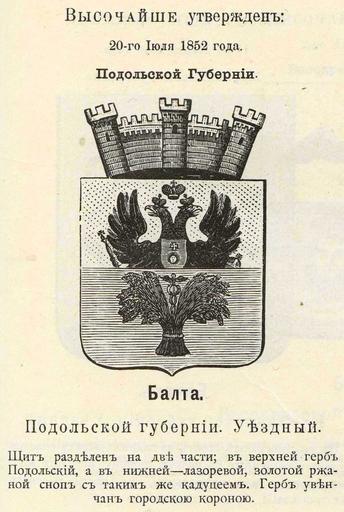 Keywords: Балта 1852 из Винклера.jpg Official Russian Empire coat of arms Balta Ге б Российской Импе ии го ода уездного го ода Балта Подольской губе нии с официальным описанием в Ге бовнике Винкле а П П фон-Винкле Ге бы го одов губе ний областей и посадов Российской Импе ии внесенные в Полное Соб ание законов с 1649 по 1900 год Дозволено цензу ою С -Пете бу г 20 Июля 1899 года Издание книгото говца Ив Ив Иванова С -Пете бу г Типог афия И Комелова П яжка д 3 1899 \ Scanned paper book 1852 \ 1899 published П П фон Винкле \ Pavel von Vinkler PD-old PD-RusEmpire PD-RU-exempt coats of arms Gerbovnik Vinklera - City CoAs Coats of arms of cities in Podolia Governorate Coats of arms of Balta Odessa Oblast History of Balta Historical coats of arms of Odessa Oblast |