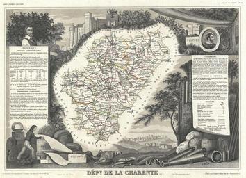 | Keywords: 1852 Levasseur Map of the Department La Charente, France (Cognac and Pineau Wine Region) - Geographicus - Charente-levasseur-1852.jpg This is a fascinating 1857 map of the French department of Charente France This area of France is famous for its production of a wide variety of goat cheeses such as Chabichou Mothais Buche du Poitou and Chabi In fact it produces a third of all the goat cheese in France The region is also known for its production of fine Cognacs and Pineau wine The whole is surrounded by elaborate decorative engravings designed to illustrate both the natural beauty and trade richness of the land There is a short textual history of the regions depicted on both the left and right sides of the map Published by V Levasseur in the 1852 edition of his Atlas National de la France Illustree 1852 undated Size in 16 11 5 object history credit line accession number Charente-levasseur-1852 Levassuer V <i>Atlas National Illustre des 86 Departements et des Possessions de La France Divise par Arrondissements Cantons et Communea avec La Trace de Toutes Les Routes Chemins de fer et Canaux </i> 1852 edition Geographicus-source PD-old-100 Victor Levasseur - Maps of France 1852 maps Old maps of Charente |