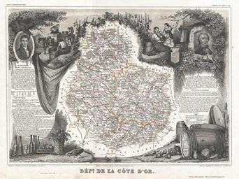 | Keywords: 1852 Levasseur Map of the Department Cote D'Or, France (Burgundy or Bourgogne Wine Region) - Geographicus - CoteDOr-levasseur-1852.jpg This is a fascinating 1857 map of the French department of Cote D ™Or France Part of France's Burgundy or Bourgogne wine region a premier wine-growing region of France It produces what are arguably the world ™s finest and most expensive Pinot noir and Chardonnay wines The whole is surrounded by elaborate decorative engravings designed to illustrate both the natural beauty and trade richness of the land There is a short textual history of the regions depicted on both the left and right sides of the map Published by V Levasseur in the 1852 edition of his Atlas National de la France Illustree 1852 undated Size in 16 5 12 object history credit line accession number CoteDOr-levasseur-1852 Levassuer V <i>Atlas National Illustre des 86 Departements et des Possessions de La France Divise par Arrondissements Cantons et Communea avec La Trace de Toutes Les Routes Chemins de fer et Canaux </i> 1852 edition Geographicus-source PD-old-100 Victor Levasseur - Maps of France 1852 maps Maps of Côte-d'Or Old maps of Côte-d'Or Coats of arms of Dijon Georges-Louis Leclerc comte de Buffon Lazare Nicolas Marguerite Carnot Wine and vineyard engraving Maps in French Wine routes |