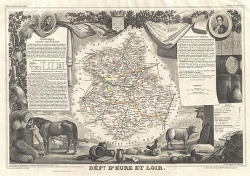 | Keywords: 1852 Levasseur Map of the Department D'Eure Et Loir, France (Loire Wine Region) - Geographicus - EureEtLoir-levasseur-1852.jpg This is a fascinating 1852 map of the French department of Eure Et Loir France This area is home to the famous Chartres Cathedral The whole is surrounded by elaborate decorative engravings designed to illustrate both the natural beauty and trade richness of the land There is a short textual history of the regions depicted on both the left and right sides of the map Published by V Levasseur in the 1852 edition of his Atlas National de la France Illustree Carte Victor Levasseur du département d'Eure-et-Loir 1852 1852 undated Size in 16 5 11 5 object history credit line accession number EureEtLoir-levasseur-1852 Levassuer V <i>Atlas National Illustre des 86 Departements et des Possessions de La France Divise par Arrondissements Cantons et Communea avec La Trace de Toutes Les Routes Chemins de fer et Canaux </i> 1852 edition Geographicus-source PD-old-100 Victor Levasseur - Maps of France 1852 maps Old maps of Eure-et-Loir Maps in French Claude François Chauveau-Lagarde Engravings of animals Chartres in art coat of arms 1852 works in France Animals on maps |