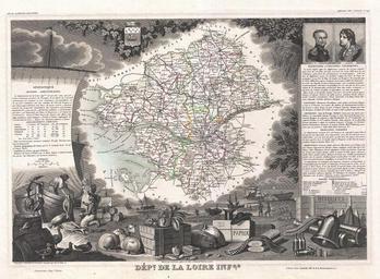 | Keywords: 1852 Levasseur Map of the Department De La Loire Inferieure, France (Muscadet Wine Region) - Geographicus - LoireInferieure-levasseur-1852.jpg This is a fascinating 1852 map of the French department of Loire Inferieure France currently known as Loire-Atlantique This area of France is part of the Loire Valley wine region and is especially known for its production of Muscadet a white wine produced from the Melon de Bourgogne grape variety This area is also famous for a variety of cow ™s milk cheese known as Fromage du CurĂ© Nantais The map proper is surrounded by elaborate decorative engravings designed to illustrate both the natural beauty and trade richness of the land There is a short textual history of the regions depicted on both the left and right sides of the map Published by V Levasseur in the 1852 edition of his Atlas National de la France Illustree 1852 undated Size in 17 12 object history credit line accession number LoireInferieure-levasseur-1852 Levassuer V <i>Atlas National Illustre des 86 Departements et des Possessions de La France Divise par Arrondissements Cantons et Communea avec La Trace de Toutes Les Routes Chemins de fer et Canaux </i> 1852 edition Geographicus-source PD-old-100 1852 maps France Old maps of Loire-Atlantique Coats of arms of Nantes Pierre Cambronne Peter Abelard Fishermen in art Maps in French France Victor Levasseur - Maps of France France Muscadet AOC |