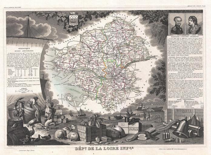 Keywords: 1852 Levasseur Map of the Department De La Loire Inferieure, France (Muscadet Wine Region) - Geographicus - LoireInferieure-levasseur-1852.jpg This is a fascinating 1852 map of the French department of Loire Inferieure France currently known as Loire-Atlantique This area of France is part of the Loire Valley wine region and is especially known for its production of Muscadet a white wine produced from the Melon de Bourgogne grape variety This area is also famous for a variety of cow ™s milk cheese known as Fromage du CurĂ© Nantais The map proper is surrounded by elaborate decorative engravings designed to illustrate both the natural beauty and trade richness of the land There is a short textual history of the regions depicted on both the left and right sides of the map Published by V Levasseur in the 1852 edition of his Atlas National de la France Illustree 1852 undated Size in 17 12 object history credit line accession number LoireInferieure-levasseur-1852 Levassuer V <i>Atlas National Illustre des 86 Departements et des Possessions de La France Divise par Arrondissements Cantons et Communea avec La Trace de Toutes Les Routes Chemins de fer et Canaux </i> 1852 edition Geographicus-source PD-old-100 1852 maps France Old maps of Loire-Atlantique Coats of arms of Nantes Pierre Cambronne Peter Abelard Fishermen in art Maps in French France Victor Levasseur - Maps of France France Muscadet AOC |