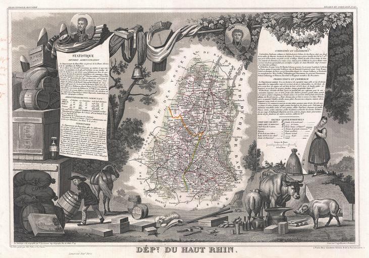 | Keywords: 1852 Levasseur Map of the Department Du Haut Rhin, France (Alsace Wine Region) - Geographicus - HauteRhin-levasseur-1852.jpg This is a fascinating 1852 map of the French department of Haut-Rhin France This mountainous area is part of the Alsace wine region and is known for its production of both Pinot Noir and Pinot Gris The map proper is surrounded by elaborate decorative engravings designed to illustrate both the natural beauty and trade richness of the land There is a short textual history of the regions depicted on both the left and right sides of the map Published by V Levasseur in the 1852 edition of his Atlas National de la France Illustree 1852 undated Size in 16 5 11 5 object history credit line accession number HauteRhin-levasseur-1852 Levassuer V <i>Atlas National Illustre des 86 Departements et des Possessions de La France Divise par Arrondissements Cantons et Communea avec La Trace de Toutes Les Routes Chemins de fer et Canaux </i> 1852 edition Geographicus-source PD-old-100 Victor Levasseur - Maps of France France 1852 maps France Old maps of Haut-Rhin |