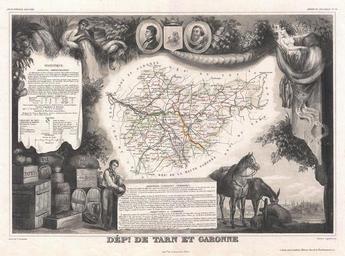 | Keywords: 1852 Levasseur Map of the Department De Tarn Et Garonne, France - Geographicus - TarnEtGaronne-levasseur-1852.jpg This is a fascinating 1852 map of the French department of Tarn et Garonne France This map is centered around the city of Moissac which is known for its fine desert grapes This area produces a number of quality wines such as AOC Fronton Cotes de Brulhois and the Vins de Pays des Côteaux et Terrasses de Montauban Tarn et Garonne is also home to the area of Côteaux du Quercy which has a reputation for producing supple and full-bodied wines This region is also a historic stopping point on the Pilgrimage to Santiago de Compostella The map proper is surrounded by elaborate decorative engravings designed to illustrate both the natural beauty and trade richness of the land There is a short textual history of the regions depicted on both the left and right sides of the map Published by V Levasseur in the 1852 edition of his Atlas National de la France Illustree 1852 undated Size in 16 5 12 object history credit line accession number TarnEtGaronne-levasseur-1852 Levassuer V <i>Atlas National Illustre des 86 Departements et des Possessions de La France Divise par Arrondissements Cantons et Communea avec La Trace de Toutes Les Routes Chemins de fer et Canaux </i> 1852 edition Geographicus-source PD-old-100 1852 maps France Old maps of Tarn-et-Garonne Coats of arms of France to be classified Maps in French France Jean Auguste Dominique Ingres Jacques Nompar de Caumont Victor Levasseur - Maps of France France |