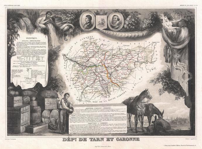 Keywords: 1852 Levasseur Map of the Department De Tarn Et Garonne, France - Geographicus - TarnEtGaronne-levasseur-1852.jpg This is a fascinating 1852 map of the French department of Tarn et Garonne France This map is centered around the city of Moissac which is known for its fine desert grapes This area produces a number of quality wines such as AOC Fronton Cotes de Brulhois and the Vins de Pays des Côteaux et Terrasses de Montauban Tarn et Garonne is also home to the area of Côteaux du Quercy which has a reputation for producing supple and full-bodied wines This region is also a historic stopping point on the Pilgrimage to Santiago de Compostella The map proper is surrounded by elaborate decorative engravings designed to illustrate both the natural beauty and trade richness of the land There is a short textual history of the regions depicted on both the left and right sides of the map Published by V Levasseur in the 1852 edition of his Atlas National de la France Illustree 1852 undated Size in 16 5 12 object history credit line accession number TarnEtGaronne-levasseur-1852 Levassuer V <i>Atlas National Illustre des 86 Departements et des Possessions de La France Divise par Arrondissements Cantons et Communea avec La Trace de Toutes Les Routes Chemins de fer et Canaux </i> 1852 edition Geographicus-source PD-old-100 1852 maps France Old maps of Tarn-et-Garonne Coats of arms of France to be classified Maps in French France Jean Auguste Dominique Ingres Jacques Nompar de Caumont Victor Levasseur - Maps of France France |