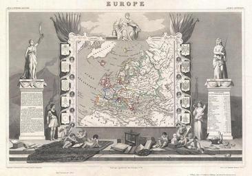 | Keywords: 1852 Levasseur Map of Europe - Geographicus - Europe-levasseur-1852.jpg A fine example of V Levasseur's desirable decorative map of Europe dated 1852 Shows the entire continent according to political situation of the time The whole is surrounded by elaborate decorative engravings designed to illustrate cultural heritage of the continent Shows the armorial crests of France England Spain Italy Switzerland Russia Prussia Germany Sweden and Turkey There is a short textual history of the region depicted on both the left and right sides of the map Published by V Levasseur in the 1852 edition of his Atlas National de la France Illustree 1852 undated Size in 17 5 12 75 object history credit line accession number Europe-levasseur-1852 Levassuer V <i>Atlas National Illustre des 86 Departements et des Possessions de La France Divise par Arrondissements Cantons et Communea avec La Trace de Toutes Les Routes Chemins de fer et Canaux </i> 1852 edition Geographicus-source PD-old-100 Victor Levasseur - Maps of the world Old maps of Europe 1852 maps Historical coats of arms Putti Unidentified allegories |