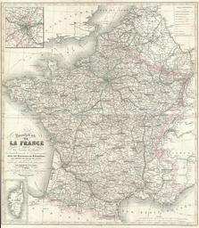 | Keywords: 1852 Levasseur Map of France - Geographicus - France-levasseur-1852.jpg This is a folio format map of France issued with Victor Levasseur's 1852 Atlas National Illustre Covers all of France as well as adjacent parts of Italy Span and England Shows all Departments as well as postal routes major cities rivers and roadways Indicates mileage between most towns Additionally shows ferry and shipping routes in the Mediterranean and in the English Channel An inset in the lower left quadrant focuses on Corsica A second inset in the upper left quadrant details the vicinity of Paris 1852 dated Size in 21 24 object history credit line accession number France-levasseur-1852 Levassuer V <i>Atlas National Illustre des 86 Departements et des Possessions de La France Divise par Arrondissements Cantons et Communea avec La Trace de Toutes Les Routes Chemins de fer et Canaux </i> 1852 edition Geographicus-source PD-old-100 Victor Levasseur - Maps of France Old maps of France 1852 maps Maps of Paris in the 19th century 19th-century maps of Paris Maps in French Postal route |