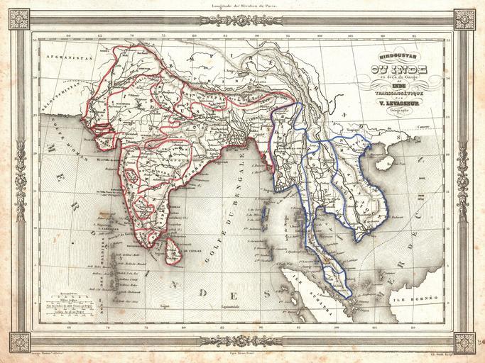 | Keywords: 1852 Levasseur Map of India and Southeast Asia - Geographicus - India-levassuer-1852.jpg A beautiful 1852 map of India and Southeast Asia by Victor Levasseur Features the entire sub-continent as well as all of Southeast Asia Includes the modern day nations of India Pakistan Bangladesh Nepal Thailand Vietnam Cambodia Laos Burma and Malaysia Identifies major cities rivers mountains and various other topographical features Features a neoclassical decorative border Prepared by V Levasseur for publication as plate no 23 in Maison Basset ™s 1852 edition of the Atlas Illustre 1852 undated Size in 13 10 object history credit line accession number India-levassuer-1852 Duvotenay T <i>Atlas Illustre</i> Maison Basset 1852 Geographicus-source PD-old-100 Victor Levasseur - Maps of the world Old maps of the Indian Subcontinent 1852 maps of India Old maps of Southeast Asia Maps in French |