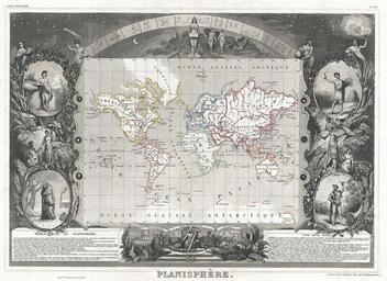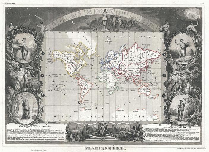 | Keywords: 1852 Levasseur Map of the World - Geographicus - Planisphere-levasseur-1852.jpg A visually stunning decorative map of the world dating to 1852 by French map publisher Victor Levasseur Levasseur depicts the world on a Mercator Projection showing the six known continents as well as traces of Antarctica The cartographic style of this piece is minimalist but a few elements do bear special note These include the extension of Oregon territory well into British Columbia reflecting the American claims that later led to the 54 40' dispute Also in North America Texas is identified as an independent nation Far to the north both the Northwest Passage over America and the Northeast Passage over Europe and Asia are drawn as open and practically navigable waterways By far this map's most striking feature is its elaborate allegorical border work Levasseur composed this map for publication in his magnificent Atlas Nacionale de la France Illustree one of the most decorative and beautifully produced atlases to appear in the 19th century This particular map is surrounded by four medallions bearing allegorical representation of each season Spring in the upper left is represented by a young unclothed woman modestly covering herself with garlands Summer in the lower right is a powerful bearded man wearing an animal skin and surrounded by the bounty of life Fall upper right is a young man reaping the harvest And winter lower left is a huddled old woman in a barren snow covered setting Atop the map is an image of the firmament with shooting starts clouds and a symbolic representation of the Zodiac At center is a curious unclothed women with four breasts who appears to be chained to the earth or to a heavy box which she is holding - Pandora Adam and Eve appear to her right walking hand in hand through pre-fall Eden There too is the serpent slithering just behind the couple At the base of the map an even more interesting scene unfolds in the form of a curious panorama Here Jesus sits enthroned bearing a cross in his left hand and pointing with his right his head surrounded by a pyramid a Masonic reference To his left are a stoic crowd including Napoleon Socrates and other unidentifiable great men bearing signs reading Paix peace Liber freedom and Egalite equality Behind them is a domed building that appears to be a Greek or Roman temple Opposite this scene on Jesus' right is a very different scene showing a crowd fleeing in terror - these include a Pharisee holding the Torah and a turbaned Saracen Behind them are the pyramids of Egypt They are running towards what appears to be the jungle in the midst of which is a plinth upon which sets a bust of Satan In this we can only assume that Levasseur is attempting to convey the righteousness of reason and logic over emotion and old world superstition Publised by V Levasseur as page no 95 in the 1852 edition of his Atlas National de la France Illustree 1852 undated Size in 16 5 12 5 object history credit line accession number Planisphere-levasseur-1852 Levassuer V <i>Atlas National Illustre des 86 Departements et des Possessions de La France Divise par Arrondissements Cantons et Communea avec La Trace de Toutes Les Routes Chemins de fer et Canaux </i> 1852 edition Geographicus-source PD-old-100 Victor Levasseur - Maps of the world 1850s maps of the world 1852 maps Nudes in art Nude or partially nude chained women in art |