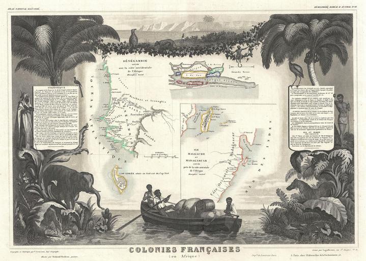 Keywords: 1852 Levassuer Map of Senegal, Senegambia, and Madagascar - Geographicus - Senegal-levasseur-1852.jpg This is a fascinating 1852 Levasseur map of the French Colonies in Africa The map area is divided into three sections dedicated to Senegambie Senegambia Madagascar and the Senegal River The largest of these focuses on Senegambia with an inset of the Island of Goree in the lower left The map proper is surrounded by elaborate decorative engravings designed to illustrate both the natural beauty and trade richness of the land There is a short textual history of the region depicted to the left and right of the map Published by V Levasseur in the 1852 edition of his Atlas National de la France Illustree 1852 undated Size in 17 11 5 object history credit line accession number Senegal-levasseur-1852 Levassuer V <i>Atlas National Illustre des 86 Departements et des Possessions de La France Divise par Arrondissements Cantons et Communea avec La Trace de Toutes Les Routes Chemins de fer et Canaux </i> 1852 edition Geographicus-source PD-old-100 Victor Levasseur - Maps of the world Old maps of Senegal Old maps of Gambia Old maps of Madagascar 1852 maps 1852 in Gambia Senegambia region |