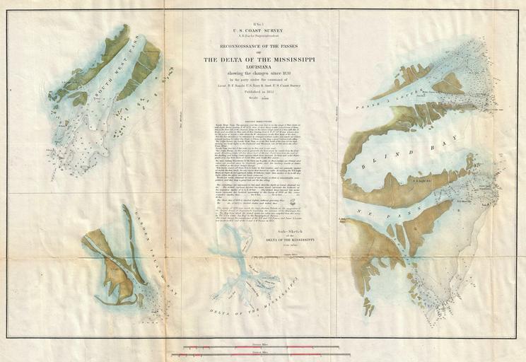 Keywords: 1852 U.S. Coast Survey Map of the Mississippi River Delta - Geographicus - MississippiDelta-uscs-1852.jpg An attractive hand colored 1852 U S Coast Survey triangulation chart or map of the Mississippi Delta This map is in fact a composite of four different maps detailing different parts of the Delta The first map in the upper left quadrant details the Southwest Pass entrance to the Mississippi Map number two in the lower left quadrant details South Pass and Garden Island Bay Map number three bottom center details the Delta as a whole Map number four occupying the entire right hand section of the map shows Passe a Loutre Blind Pay and North East Pass Shows the locations of light houses shoals Drift Trees Stakes and offers innumerable depth soundings The center of the map is occupied by a large text area offering detailed sailing instructions Prepared by a party under the command of Lieutenant B F Sands Compiled under the direction of A D Bache Superintendent of the Survey of the Coast of the United States and one of the most influential American cartographers of the 19th century 1852 dated Size in 20 5 14 object history credit line accession number MississippiDelta-uscs-1852 <i>Report of the Superintendant of the U S Coast Survey </i> 1852 edition Geographicus-source PD-art United States Coast Survey maps Maps of Plaquemines Parish Louisiana 1852 U S Coast survey 1852 maps 1852 in Louisiana Old maps of Louisiana |