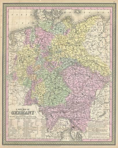 Keywords: 1853 Mitchell Map of Germany - Geographicus - Germany-mitchell-1850.jpg An attractive example of S A Mitchell Sr ™s 1853 map of Germany Depicts the entire country color coded according to individual German states Unlike most of Mitchell's European series this map did not appear in all editions of the Atlas It was prepared in 1853 to replace and earlier smaller map of the same region - despite this Mitchell chose to save money by not updating the copyright hence it is still dated to 1850 Surrounded by the green border common to Mitchell maps from the 1850s Prepared by S A Mitchell for issued as plate no 52 in the 1853 edition of his New Universal Atlas Dated and copyrighted Entered according to act of Congress in the year 1850 by Thomas Cowperthwait Co in the Clerks office of the District court of the Eastern District of Pennsylvania 1853 dated 1850 Size in 12 5 16 object history credit line accession number Germany-mitchell-1850 Mitchell Sr S A <i>A New Universal Atlas Containing Maps of the various Empires Kingdoms States and Republics Of The World </i> 1853 issue Geographicus-source PD-old-100 Maps by Samuel Augustus Mitchell Old maps of Germany Old maps of Bohemia Old maps of Austria 19th-century maps of Moravia 1853 maps English language maps of Europe |