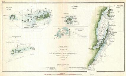 | Keywords: 1853 U.S. Coast Survey Map of Key Biscayne Bay, Key West and the Cedar Keys, Florida - Geographicus - CedarkeysBahia-uscs-1853.jpg This is an 1853 triangulation chart of Biscayne Bay Key West Bahia Honda the Cedar keys and the Dry Tortugas produced by the U S Coast Survey Essentially five maps compiled onto a single sheet Upper left map focuses on Key West Florida and the surrounding islands Upper right map details Key Biscayne Bay just south of Miami and north of Key Largo Other maps show the Cedar keys the Dry Tortugas and Bahia Honda Prepared under the supervision of A D Bache for the 1853 Report of the Superintendant of the U S Coast Survey 1853 dated Size in 16 9 5 object history credit line accession number CedarkeysBahia-uscs-1853 <i>Report of the Superintendant of the U S Coast Survey </i> 1853 edition Geographicus-source PD-art United States Coast Survey maps Old maps of Florida 1853 maps |