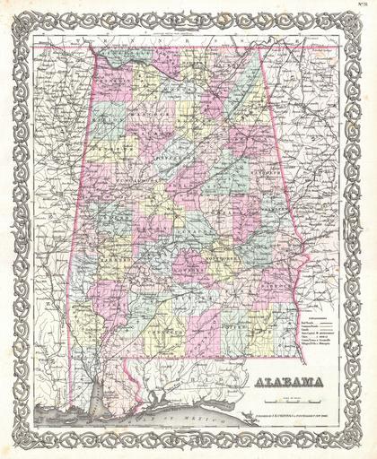 | Keywords: 1855 Colton Map of Alabama - Geographicus - Alabama-colton-1855.jpg A beautiful 1855 first edition example of Colton's map of Mississippi Covers the entire state as well as adjacent parts of Georgia and Mississippi Like most of Colton's state maps this map is largely derived from an earlier wall map of North America produced by Colton and D Griffing Johnson Colton identifies various cities towns forts rivers rapids fords and an assortment of additional topographical details Map is hand colored in pink green yellow and blue pastels to define county and state boundaries Surrounded by Colton's typical spiral motif border Dated and copyrighted to J H Colton 1855 Published from Colton's 172 William Street Office in New York City Issued as page no 31 in volume 1 of the first edition of George Washington Colton's 1855 Atlas of the World 1855 dated Size in 13 16 object history credit line accession number Alabama-colton-1855 Colton G W <i>Colton's Atlas of the World Illustrating Physical and Political Geography</i> Vol 1 New York 1855 First Edition Geographicus-source PD-art Old maps of Alabama 1855 maps |