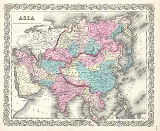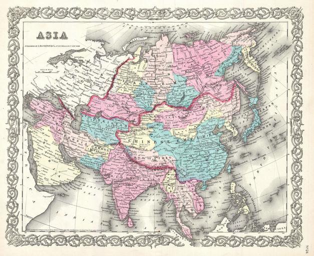 | Keywords: 1855 Colton Map of Asia - Geographicus - Asia-colton-1855.jpg A beautiful 1855 first edition example of Colton's map of Asia Covers from the Mediterranean to Siberia and from the Arctic to Singapore Color coded according to regions Includes Tibet Korea and Ladak in within the borders of the Chinese Empire Identifies both the Great Wall and the Great Canal in China Taiwan or Formosa is mapped vaguely representing the poor knowledge of the region prior to the Japanese invasion and subsequent survey work in 1895 Afghanistan is divided into Cabool and the southern province of Beloochistan Baluchistan Throughout Colton identifies various cities towns rivers and assortment of additional topographical details Names Singapore Hong Kong Macao Beijing Shanghai Edo Yedo or Tokyo Mecca and countless other important cities Surrounded by Colton's typical spiral motif border Dated and copyrighted to J H Colton 1855 Published from Colton's 172 William Street Office in New York City Issued as page no 24 in volume 2 of the first edition of George Washington Colton's 1855 Atlas of the World 1855 dated Size in 16 13 5 object history credit line accession number Asia-colton-1855 Colton G W <i>Colton's Atlas of the World Illustrating Physical and Political Geography</i> Vol 2 New York 1855 First Edition Geographicus-source PD-old-100 Maps by Joseph Hutchins Colton Old maps of Asia 1855 maps |