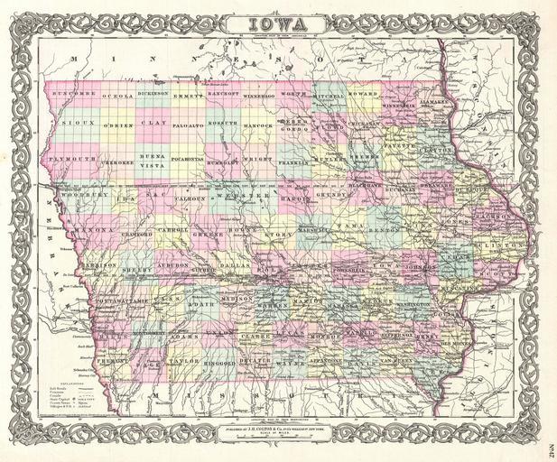| Keywords: 1855 Colton Map of Iowa - Geographicus - Iowa-colton-1855.jpg A beautiful 1855 first edition example of Colton's map of Iowa Covers the entire state as well as adjacent parts of Nebraska Missouri Minnesota Wisconsin and Illinois Like most of Colton's state maps this map is largely derived from an earlier wall map of North America produced by Colton and D Griffing Johnson Colton identifies various cities towns forts rivers rapids fords and an assortment of additional topographical details Map is hand colored in pink green yellow and blue pastels to define county and state boundaries Surrounded by Colton's typical spiral motif border Dated and copyrighted to J H Colton 1855 Published from Colton's 172 William Street Office in New York City Issued as page no 47 in volume 1 of the first edition of George Washington Colton's 1855 Atlas of the World 1855 dated Size in 16 13 object history credit line accession number Iowa-colton-1855 Colton G W <i>Colton's Atlas of the World Illustrating Physical and Political Geography</i> Vol 1 New York 1855 First Edition Geographicus-source PD-old-100 Maps by Joseph Hutchins Colton Old maps of Iowa 1855 maps |