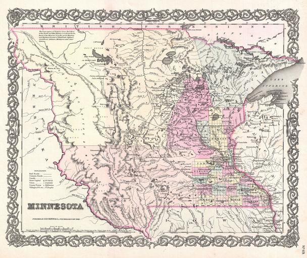| Keywords: 1855 Colton Map of Minnesota - Geographicus - Minnesota-colton-1855.jpg A beautiful 1855 first edition first state example of Colton's map of Minnesota This is one of the rarest and most desirable of all Colton atlas maps Like most of Colton's state maps this map was derived from an earlier wall map of North America produced by Colton and D Griffing Johnson Covers territorial Minnesota which included modern day North and South Dakota When the map was drawn only a small portion of southeastern Minnesota hand been plated for settlement the remainder of the territory was dominated by a number of large and powerful American Indian nations These included the Yanktonnan and Chippewa Identifies the Chippewa and Long Prairie Indian Agencies Also offers notes on the salinity of various lakes in the region and the locations of trading posts such as the Scottsman Martin McLeod's Trading Post on the Minnesota River This map further identifies various forts rivers rapids fords and an assortment of additional topographical details Map is hand colored in pink green yellow and blue pastels to define territory and state boundaries Surrounded by Colton's typical spiral motif border Dated and copyrighted to J H Colton 1855 Published from Colton's 172 William Street Office in New York City Issued as page no 49 in volume 1 of the first edition of George Washington Colton's 1855 Atlas of the World 1855 dated Size in 16 13 object history credit line accession number Minnesota-colton-1855 Colton G W <i>Colton's Atlas of the World Illustrating Physical and Political Geography</i> Vol 1 New York 1855 First Edition Geographicus-source PD-art Maps by Joseph Hutchins Colton Old maps of Minnesota 1855 maps |